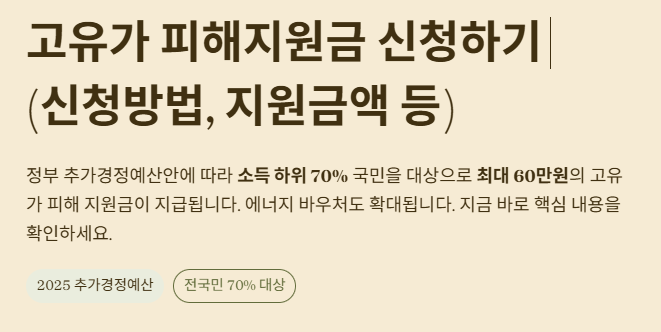 정부 추가경정예산안에 따라 소득 하위 70% 국민을 대상으로 최대 60만원의 고유가 피해 지원금이 지급되며, 에너지 바우처도 확대됩니다. 주요 내용을 빠르게 확인해보세요.