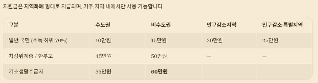 지원금은 지역별로 차등 지급되며, 사용처는 지역 화폐와 동일하게 지역 내에서만 사용 가능합니다.