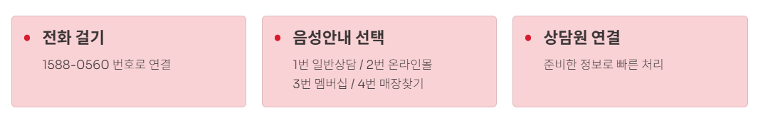 1588-0560 전화 후 음성안내에 따라 1번(일반상담), 2번(온라인몰), 3번(멤버십), 4번(매장찾기) 중 선택하세요. 대기시간을 줄이려면 오전 10시 이전이나 오후 5시 이후에 전화하는 것이 효과적입니다.