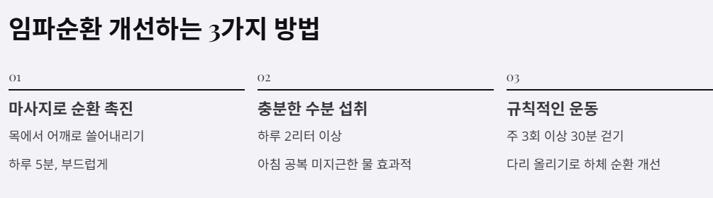 주 3회 이상 30분 걷기나 가벼운 스트레칭으로 근육 수축을 통해 임파액 흐름을 도와줍니다. 특히 다리 올리기 운동은 하체 임파순환에 도움이 됩니다.