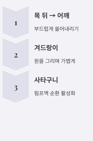 목 뒤에서 어깨 방향으로 부드럽게 쓸어내리는 마사지를 1일 5분씩 실시합니다. 겨드랑이와 사타구니 부분도 원을 그리며 가볍게 마사지하면 임파액 순환이 활발해집니다.