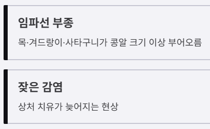 - 목, 겨드랑이, 사타구니 임파선이 콩알 크기 이상 부어오름