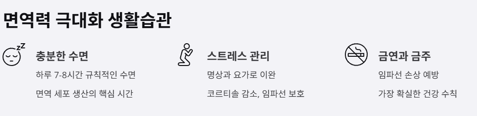충분한 수면은 면역 세포 생산을 위해 필수이며, 하루 7-8시간의 규칙적인 수면이 임파선 기능을 최적화합니다. 스트레스 관리도 중요한데, 만성 스트레스는 코르티솔 분비를 증가시켜 임파선 기능을 억제하므로 명상이나 요가 같은 이완 활동을 권장합니다. 또한 금연과 금주는 임파선 손상을 예방하는 가장 확실한 방법입니다.