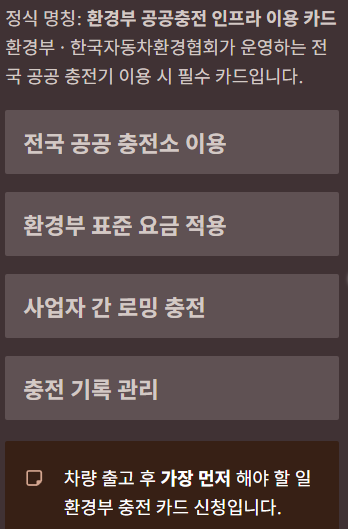 환경부 전기차 카드는 공식 명칭으로 환경부 공공충전 인프라 이용 카드입니다. 환경부와 한국자동차환경협회가 운영하는 충전소에서 사용할 수 있는 카드로, 전국 대부분의 공공 전기차 충전기를 이용할 때 필요합니다.