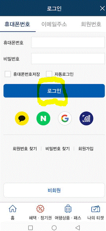 - 휴대폰과 비밀번호로 로그인 또는 비회원으로 로그인하고