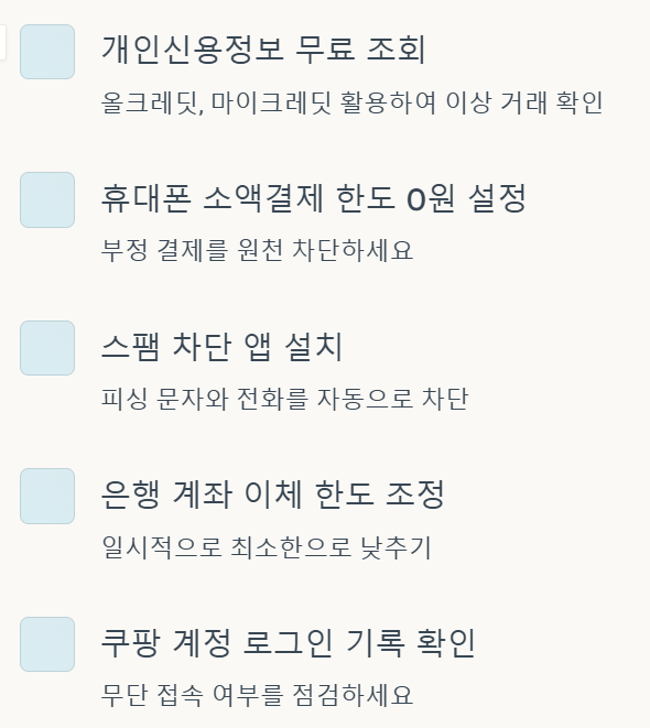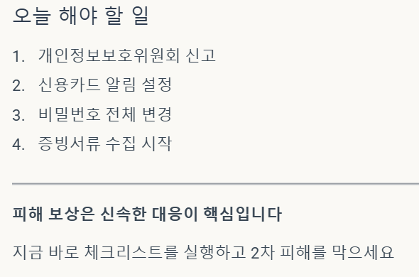 개인정보유출로 인한 피해를 최소화하고 보상을 받기 위해 반드시 챙겨야 할 필수 항목들입니다. 이 체크리스트를 따라 하나씩 실행하면 2차 피해를 막을 수 있습니다.