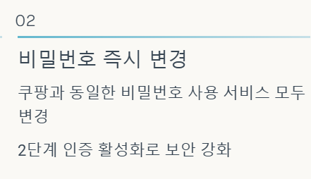 쿠팡과 동일한 비밀번호를 사용하는 모든 온라인 서비스의 비밀번호를 변경하고, 2단계 인증을 활성화하여 보안을 강화하세요.