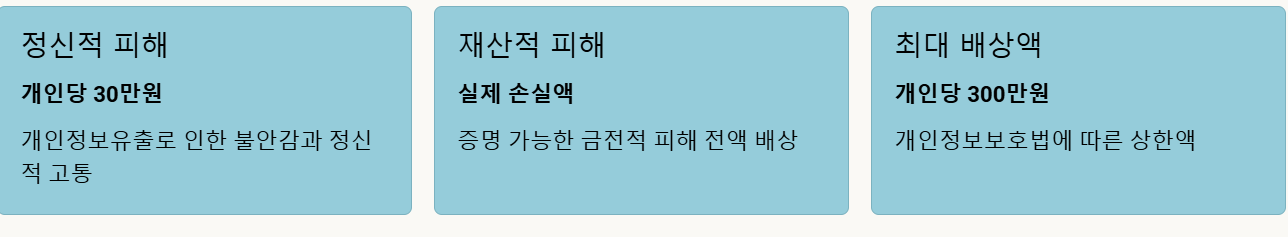 개인정보보호법에 따라 개인당 최대 300만원까지 손해배상을 청구할 수 있습니다. 정신적 피해에 대해서는 개인당 30만원, 재산적 피해는 실제 손실액을 증명하면 추가 배상이 가능합니다. 집단소송이 진행 될 경우 소송 참여 여부를 검토해보시기 바랍니다.