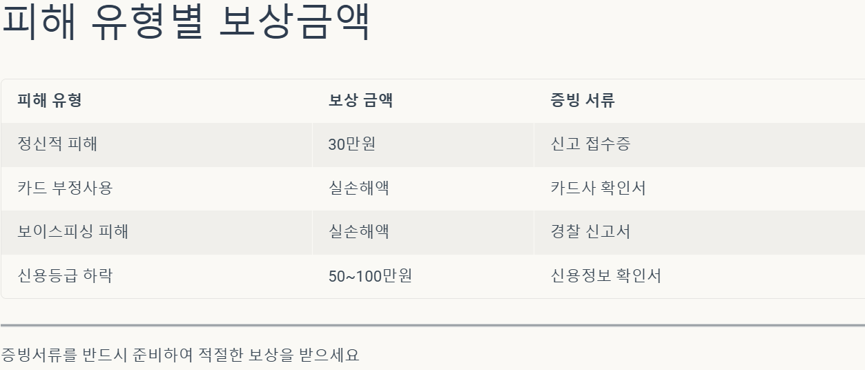 | 피해 유형 | 보상 금액 | 증빙 서류 |