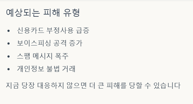 개인정보유출로 인한 피해 유형에 따라 보상금액이 다르게 책정됩니다. 아래 표를 참고하여 본인이 해당되는 피해 유형을 확인하고 피해를 입었을 시 적절한 보상을 받으시기 바랍니다.