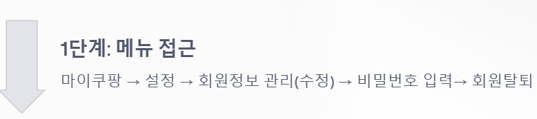 - 앱 또는 웹에서 로그인 → 마이쿠팡 → 설정 → 회원정보 관리 (수정)→ 비밀번호 입력 → 회원탈퇴 순으로 접근합니다.
