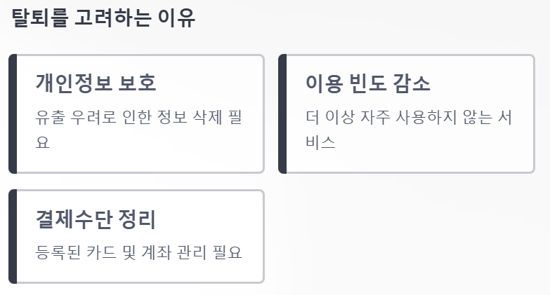 개인정보 유출 우려, 이용 빈도 감소, 결제 수단 제거 필요 등으로 회원 탈퇴를 고려합니다. 탈퇴 전에는 결제수단·환불·구독(와우) 상태를 꼭 확인하세요.