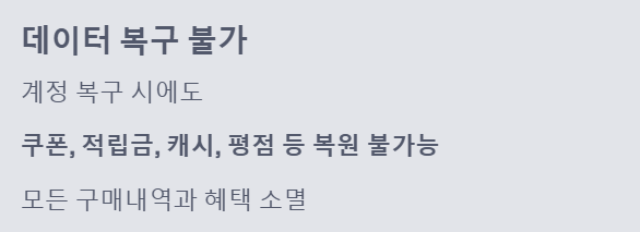 - 재가입은 가능하지만 기존 계정의 쿠폰·적립금·구매내역·평판 등 복원 불가 또는 제한될 수 있음.