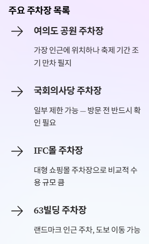여의도 주변에는 공영 및 민영 주차장이 있지만, 축제 기간에는 조기 만차가 기본입니다.