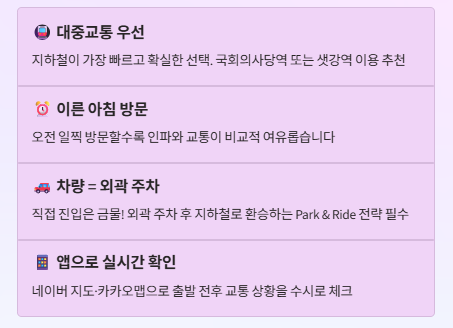 - 지하철 9호선 국회의사당역 → 도보 10~15분 (비교적 덜 붐빔)