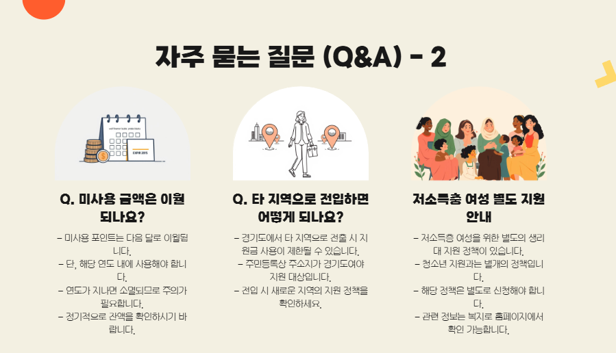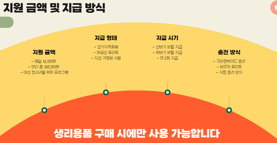 - 중복 지원 불가: 타 지역 생리대 (경기도 생리대 지원금)지원 수혜 중이면 신청 불가