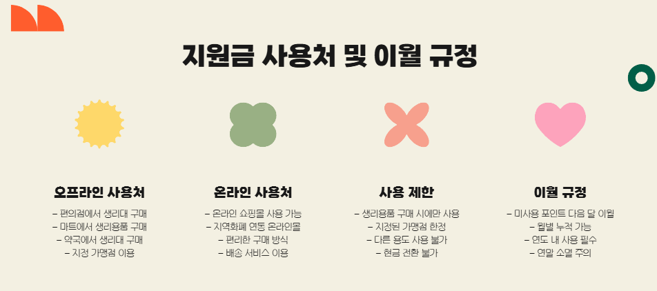 지원금은 지정된 가맹점에서 생리용품 구매 시에만 사용할 수 있습니다. 저소득층 여성을 위한 생리대 지원책은 별도의 정책으로 아래의 '저소득층 여성 생리대 바우처 지원'을 확인하시기 바랍니다.
