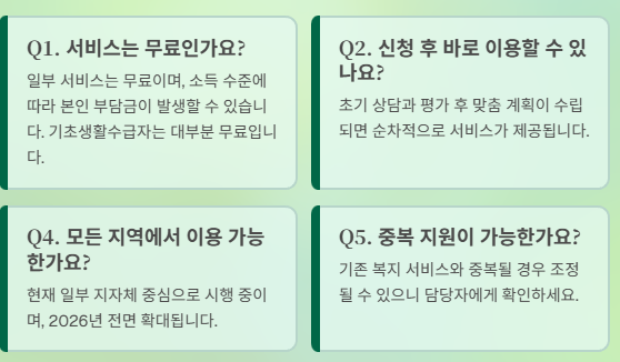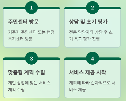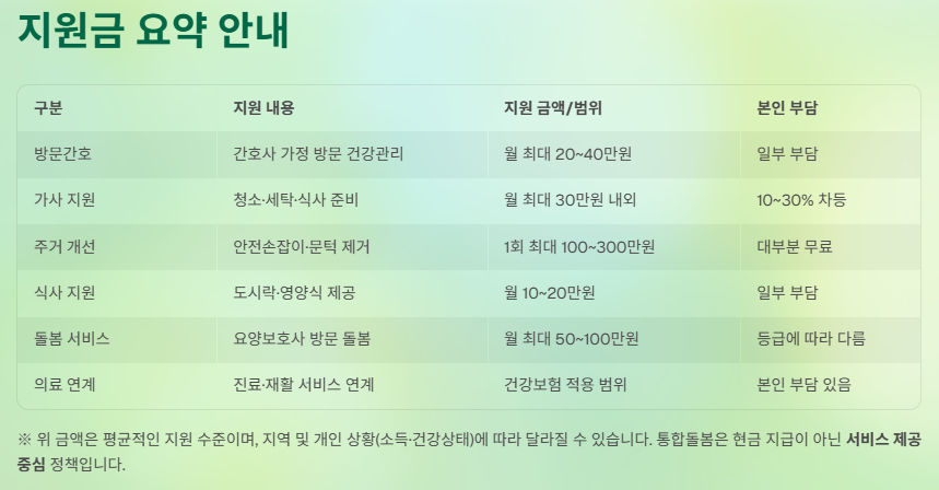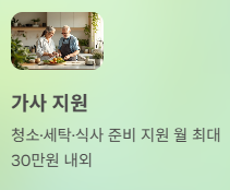 | 가사 지원 | 청소, 세탁, 식사 준비 지원 | 월 최대 30만원 내외 | 소득별 차등(10~30% 본인부담) |