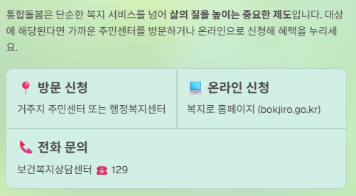 통합돌봄은 단순한 복지 서비스를 넘어 삶의 질을 높이는 중요한 제도입니다. 대상에 해당된다면 꼭 신청해 보시고 혜택을 누리시기 바랍니다.