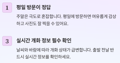 주말보다는 평일 방문이 혼잡을 피하기 좋으며, 만개일 기준 2~3일 전 도착하는 것이 가장 좋은 타이밍입니다.