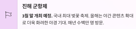 ※ 축제 일정은 날씨 및 개화 상황에 따라 변동될 수 있으므로 방문 전 확인이 필요합니다.