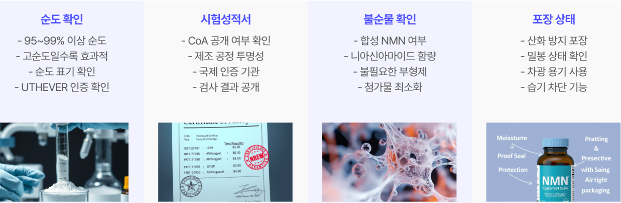 시장에 다양한 NMN 제품이 있어 품질 차이가 매우 큽니다. 구매 시 아래 요소를 꼭 확인하십시오.