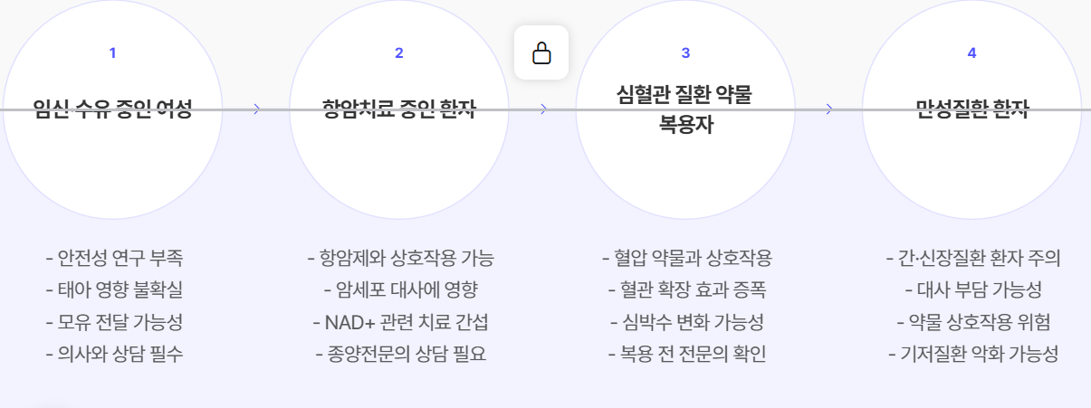 - 항노화 효과: NAD⁺ 증가를 통해 세포의 노화 속도를 늦추는 데 가능성이 있음.